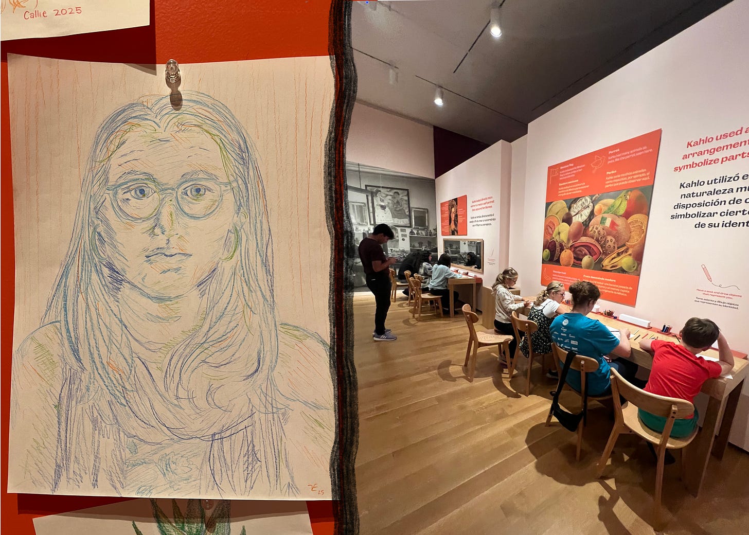The exhibit told me to draw a self-portrait, so I did. It helped that I am enamored with Frida Kahlo and her work, the focus of the exhibit. Drawing a self-portrait in the same space as her works helped me feel closer to her.